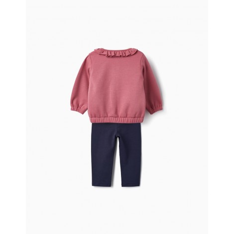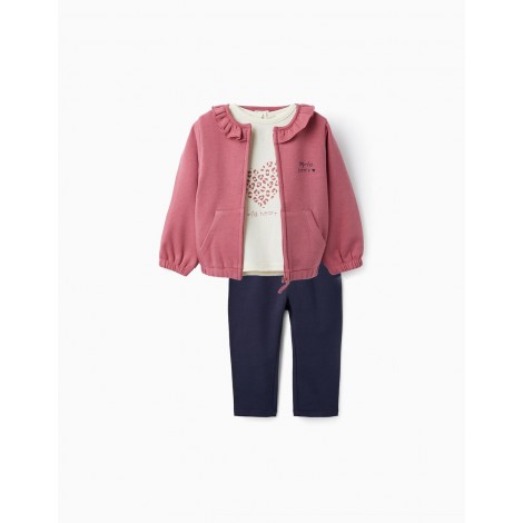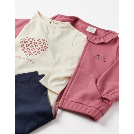 Set di tre pezzi per neonata. Felpa rosa con volant sul colletto e piccola stampa di testo blu scuro. Con chiusura frontale con cerniera e due tasche. Polsini elastici per una migliore vestibilità. T-shirt bianca a maniche lunghe con stampa di cuori con fantasia di animali e testo. La maglietta ha un bottone sul retro per indossarla più facilmente. Leggings blu scuro a tinta unita in cotone con un tocco di elastan per un eccellente comfort e libertà di movimento. Un set pratico e comodo da indossare tutti i giorni. We Care: articolo con certificazione Oeko-Tex Standard 100, che garantisce l'assenza di sostanze nocive o irritanti per la pelle. Un set pratico e caldo da indossare tutti i giorni.