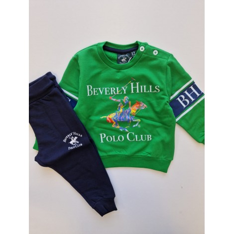 Tuta completa neonato Beverly Hills Polo Club verde logo centrale multicolor, felpa girocollo con bottoncini, sottotuta blu con logo, interno in cotone felpato
