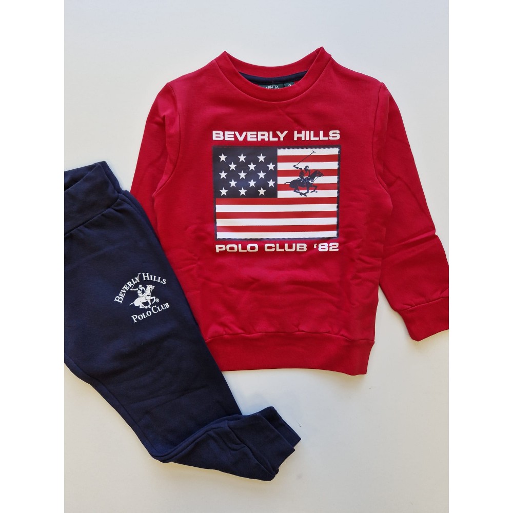 Tuta completa bambino Beverly Hills Polo Club, felpa rossa girocollo stampa centrale bandiera americana, sottotuta blu con logo, interno in cotone felpato