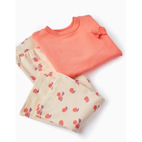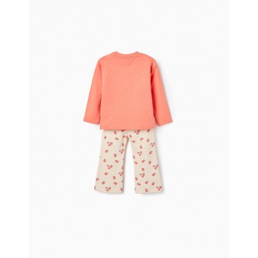 Set di due pezzi per neonata in cotone con un tocco di elastan per maggiore comfort e libertà di movimento. Comprende una felpa arancione a maniche lunghe, con colletto a costine per una migliore vestibilità. Dettaglio di un fiocco in ricamo inglese sul petto e piccole aperture laterali. Include anche un paio di pantaloni beige chiaro con fantasia pesca. Vita elastica con bande elastiche e bottoni regolabili all'interno. Un set carino e pratico.