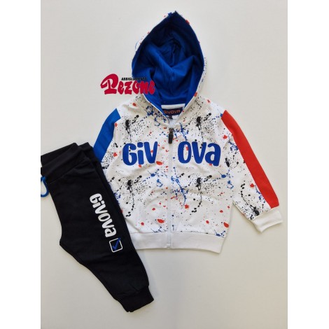 Tuta completa neonato Givova bianca fantasia macchie colorate, felpa con zip e cappuccio, sottotuta nero con logo, interno in cotone garzato