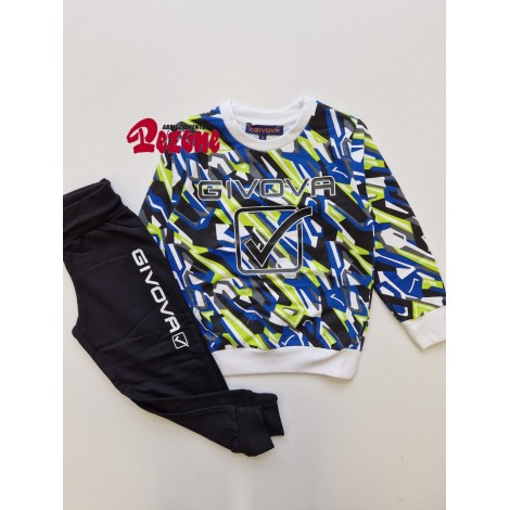 Tuta completa bambino Givova blu fantasia blocchi, felpa girocollo, sottotuta nero con logo, interno in cotone garzato