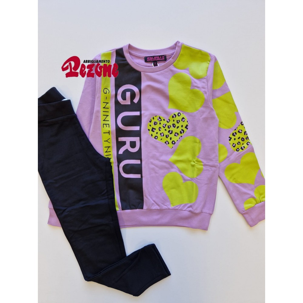 Tuta completa bambina/ragazza Guru lilla fantasia cuori, felpa girocollo, leggins nero tinta unita, interno in cotone garzato
