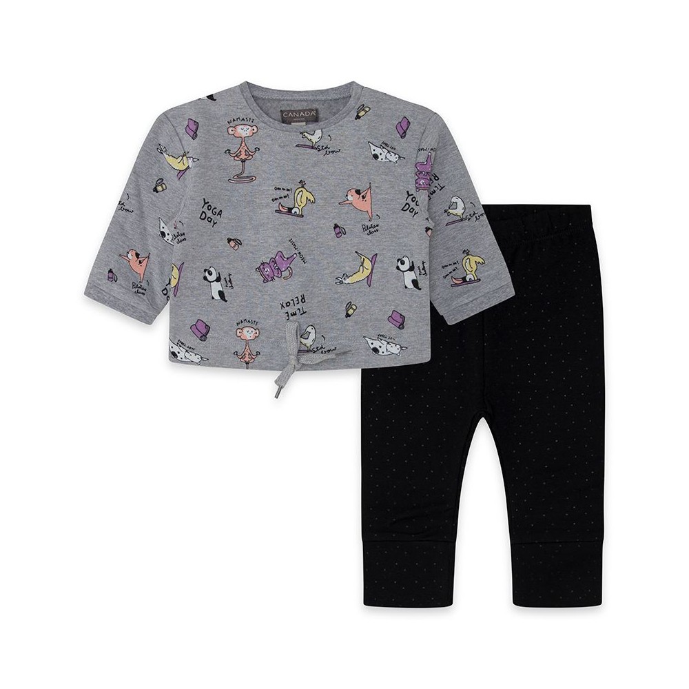 Completo neonata Canada, felpa grigia fantasia animali con interno in cotone felpato e leggings nero fantasia pois