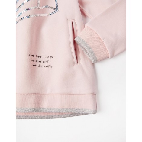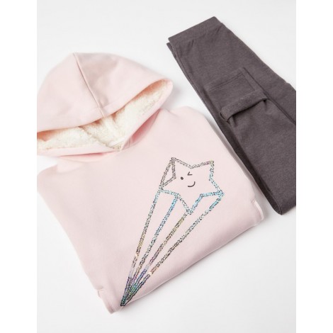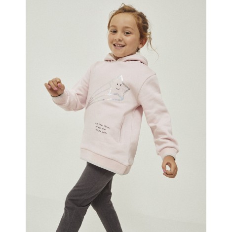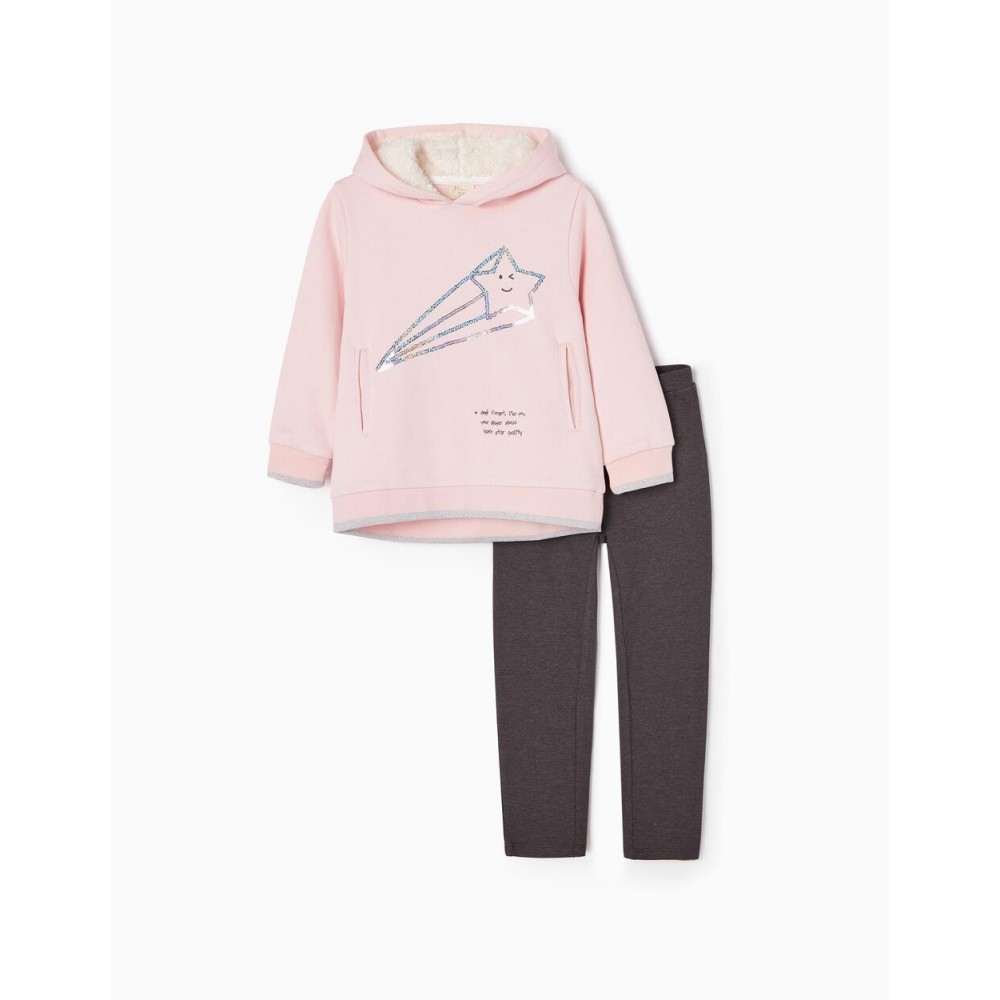 Completo felpa e leggings per bambina. Felpa rosa di media lunghezza con stella cadente in paillettes e piccolo testo stampato. Tasche laterali. Cappuccio foderato in Sherpa e interno felpato per un maggiore comfort termico. Polsini e fondo a costine con riga argentata a contrasto. Leggings tinta unita grigio scuro, in cotone elasticizzato per un maggiore comfort e libertà di movimento. Una tuta pratica e confortevole i cui pezzi possono essere indossati insieme o separatamente.