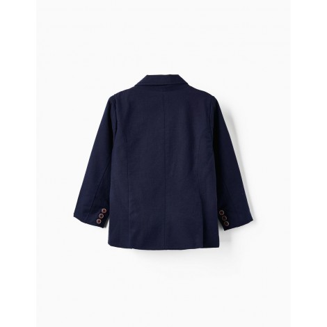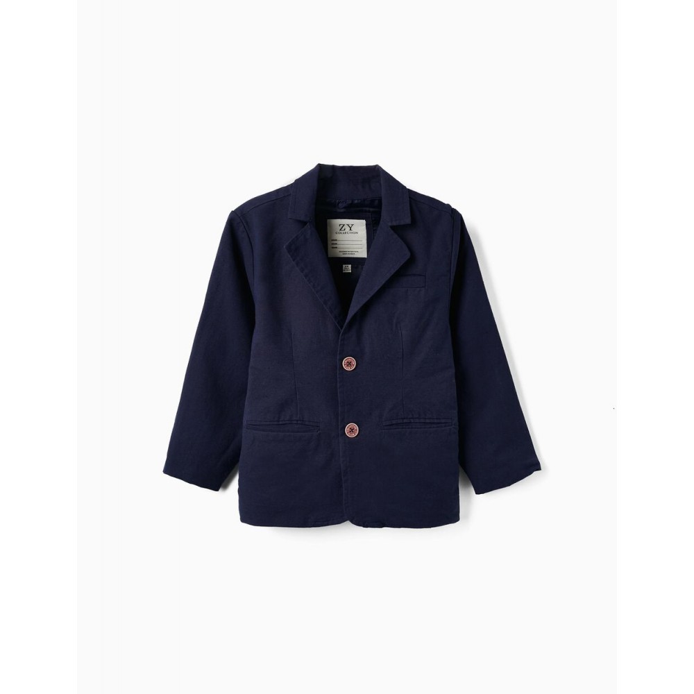 Giacca blu scuro per bambino in misto cotone con un tocco di lino. Si chiude davanti con bottoni a contrasto. Tre tasche frontali funzionali e tre bottoni decorativi su ciascun polsino. Etichetta interna per l'identificazione del bambino. Un blazer elegante e comodo.