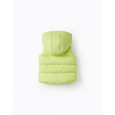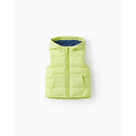 Gilet imbottito verde fluo per maschietto, con fodera, imbottitura e cappuccio blu scuro. Si chiude sul davanti con una cerniera. Tasche laterali. Etichetta identificativa all'interno per scrivere il nome del bambino. Un capo pratico e comodo per le giornate fresche. We Care: l'imbottitura di questo capo è realizzata in poliestere riciclato.