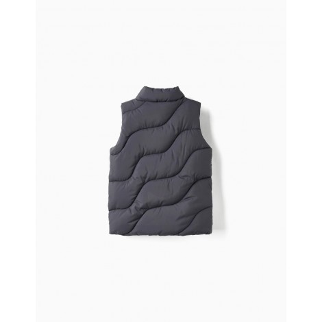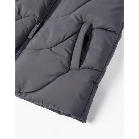 Gilet imbottito grigio scuro per bambino, 100% poliestere. Collo semialto. Si chiude con una zip per vestirsi facilmente. Due tasche frontali. Etichetta interna per inserire l'identificazione del bambino. Un capo versatile e confortevole, perfetto per le giornate più fresche. We Care: l'imbottitura di questo capo è realizzata in poliestere riciclato.